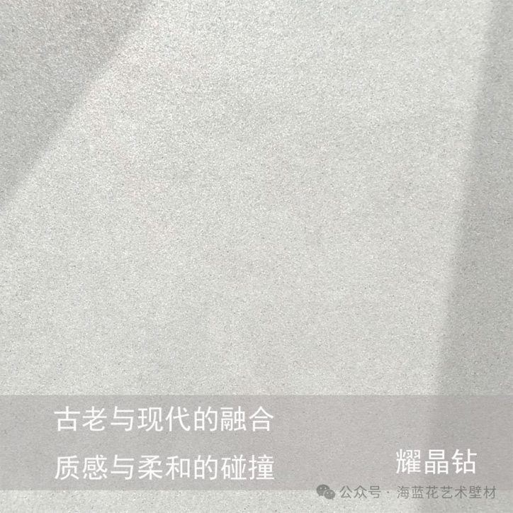 耀晶钻艺术漆是砂岩为底料,完美结合天鹅绒的视觉效果,同时满足质感硬度和素雅纹理的班驳感